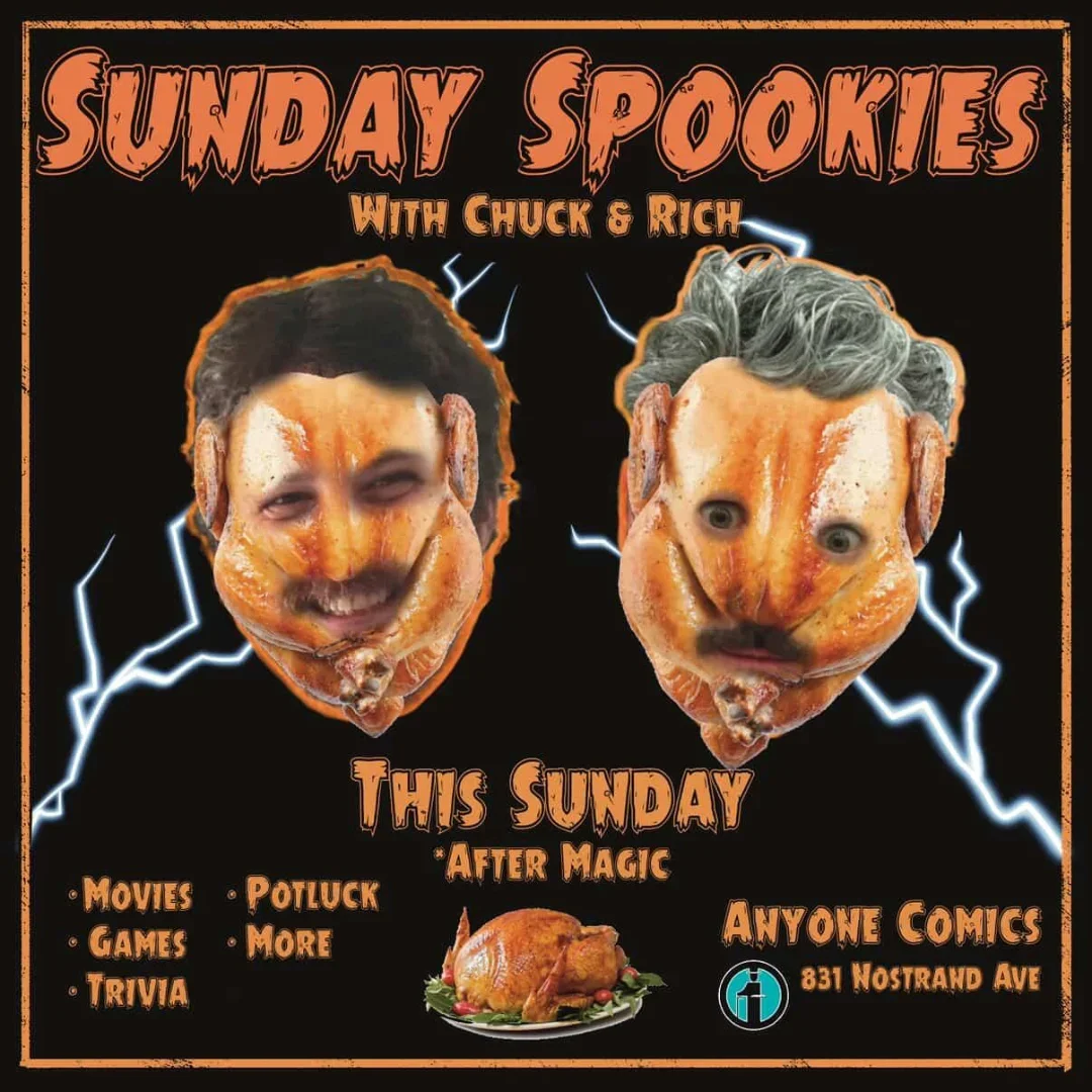 Sunday Spookies are back with @klassickaslow and @rpdub , but to get into the spirit of things, we're doing a potluck every Sunday for November. Bring corn salad, bring a rump roast, bring chips, bring cups, bring a stick figure drawing of @dimitriosfragiskatos, whatever you want. Come by watch a movie and then be prepared to take leftovers home, because we're not leaving it overnight!
